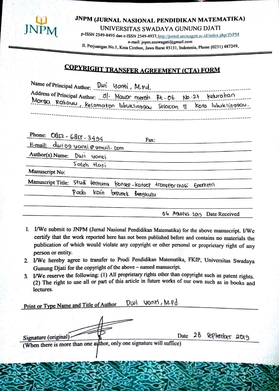 Lubis, A. N. M. T., & Yanti, D. (2018). Identifikasi Etnomatematika Batik Besurek Bengkulu Sebagai Media Dan Alat Peraga Penyampaian Konsep Kekongruenan Dan Kesebangunan. Wahana Didaktika, 16(3), 267-275.