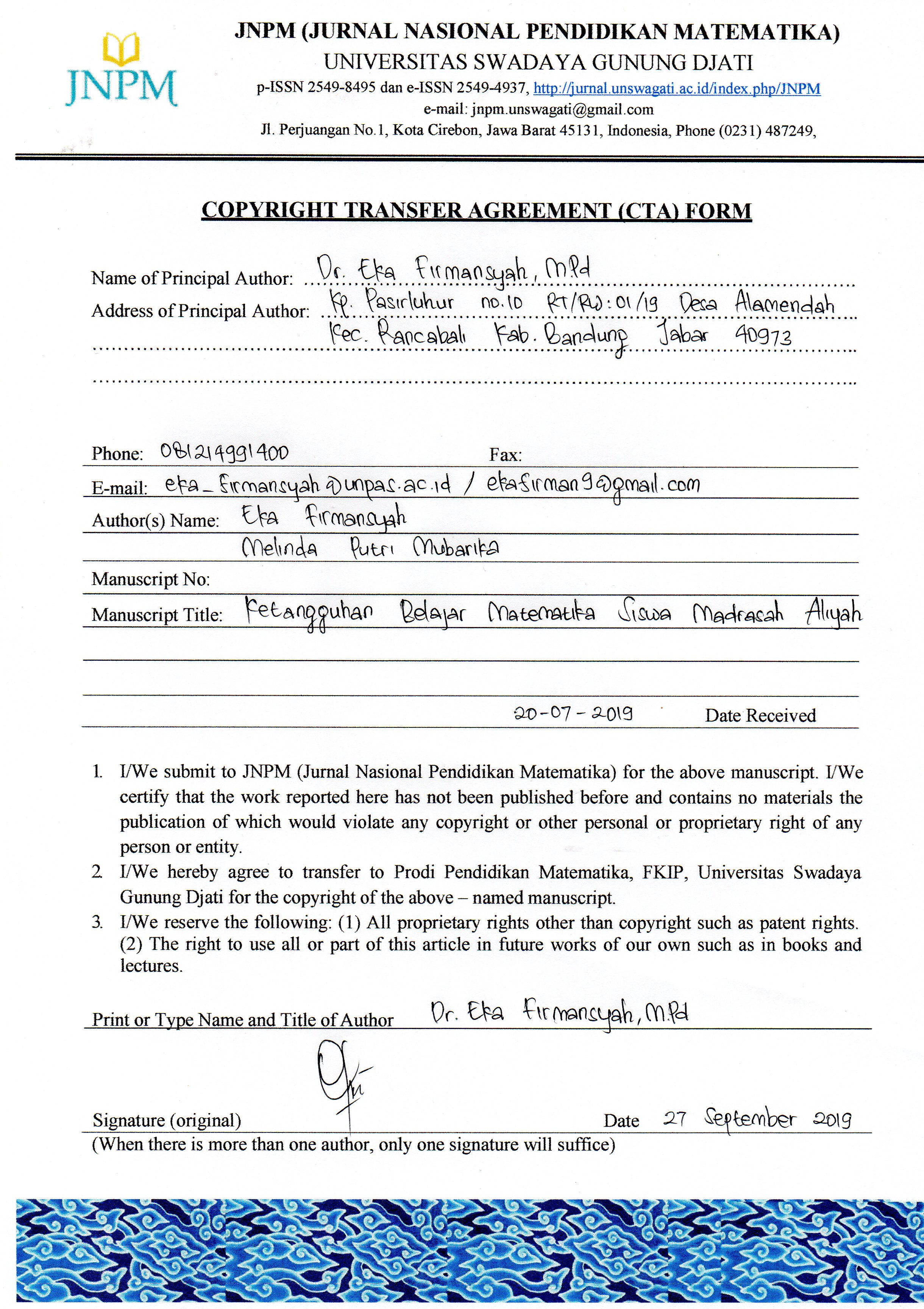 Penulis menyerahkan hak cipta dan memberikan hak penerbitan pertama kepada jurnal, dengan karya yang secara serentak dilisensikan di bawah Lisensi: Creative Commons Attribution - Share Alike 4.0 Internasional License yang memungkinkan orang lain membagikan karya dengan pengakuan penerbitan awal dan kepenulisan karya di jurnal ini.