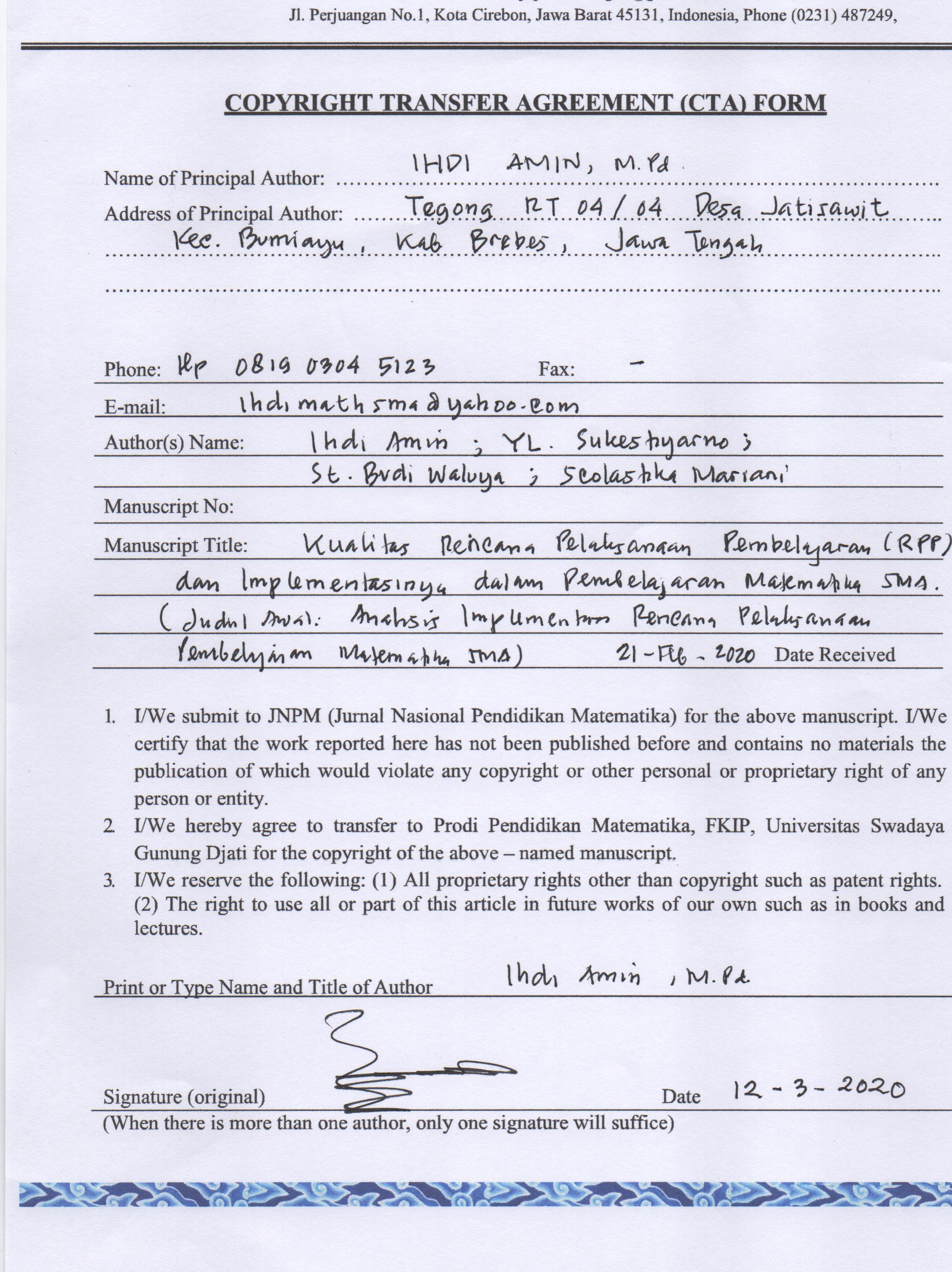 Kata kunci: Rencana Pelaksanaan Pembelajaran (RPP), Implementasi RPP, Pembelajaran Matematika.